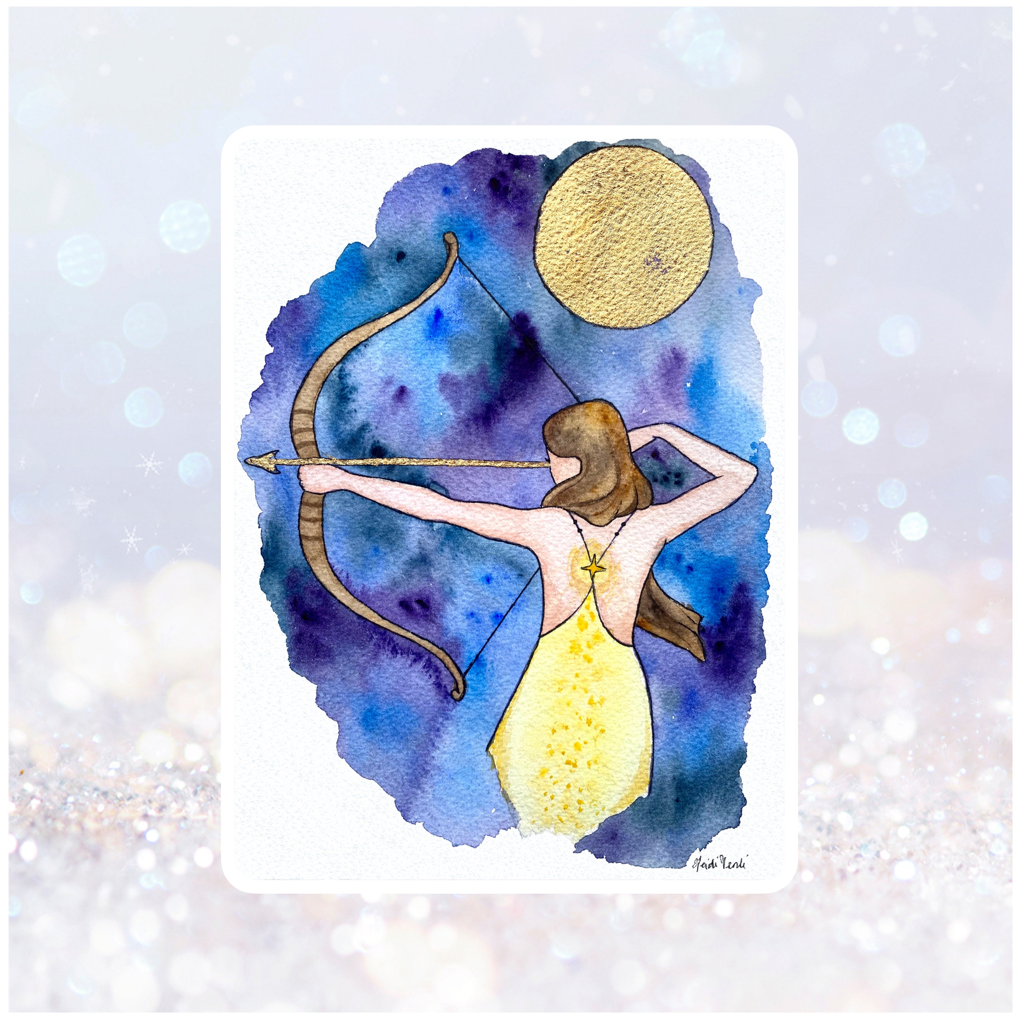 This picture fits perfectly in my living room. I feel so happy seeing the archeress as she is ready to release an arrow. The sun gives life and light and, to me, symbolizes love. The graceful archer’s strength is the light she carries within her. The power of the light gives her the precision and concentration to reach her goal. The picture inspires me to never lose sight of my goal and my dream.