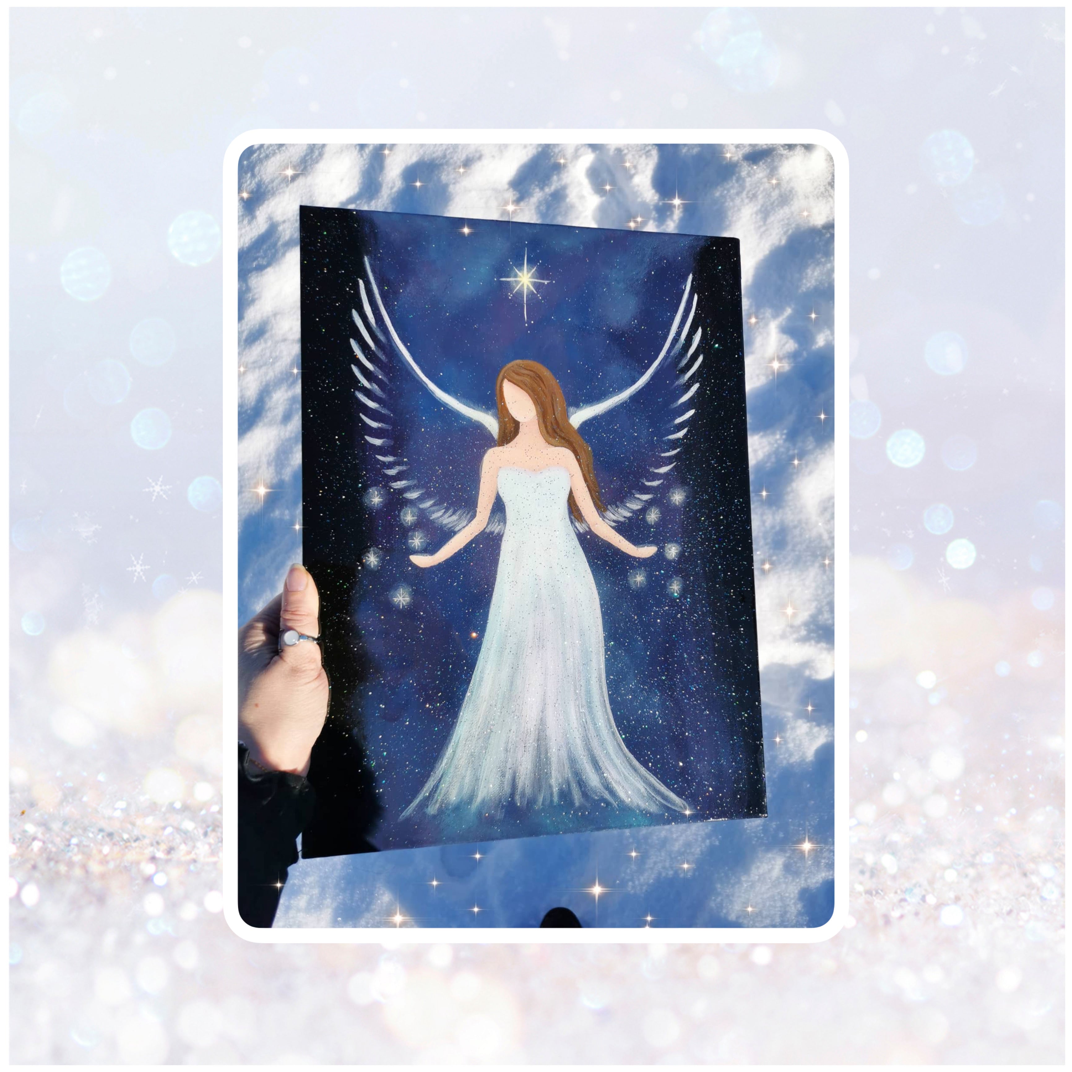 Kjøpte ett vakkert englemaleri av Heidi Venli for tre år siden. Det gir meg glede hver eneste dag. Blåfargene er helt nydelige, til og med min favorittblomst blåveis er med på bildet. Tusen takk til deg vakre sjel Heidi💙